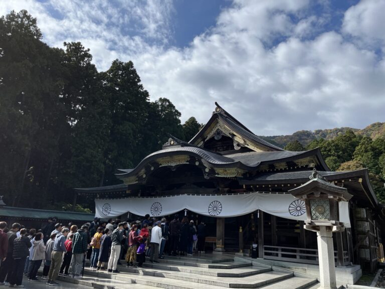 当日は雨が降ったり止んだりの天気でしたが、菊祭りの開催とかぶってか、大勢の観光客がおり参道は活気にあふれていました。