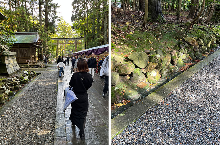 参道脇に佇む苔が生した石垣や、拝殿を支える色が褪せ灰色になった柱、緑青(ろくしょう)色(いろ)に変わった屋根材など質素さと不完全さに奥ゆかしさを感じることができました。神社特有の荘厳さはもちろんですがそこに静寂さ、ひいては日本建築の美しさがあるのだと思いました。