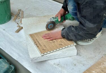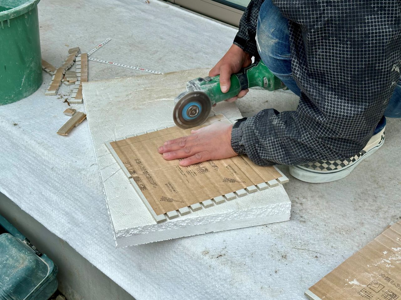 今回はタモ材の飾り棚があるので、割付に合わせてカッターでタイルを切断していきます。