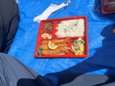 わたしたちも青空のもと満開の桜が広がる中、青いシートを広げ、おいしいお弁当を囲みながら楽しいひと時を過ごしました。