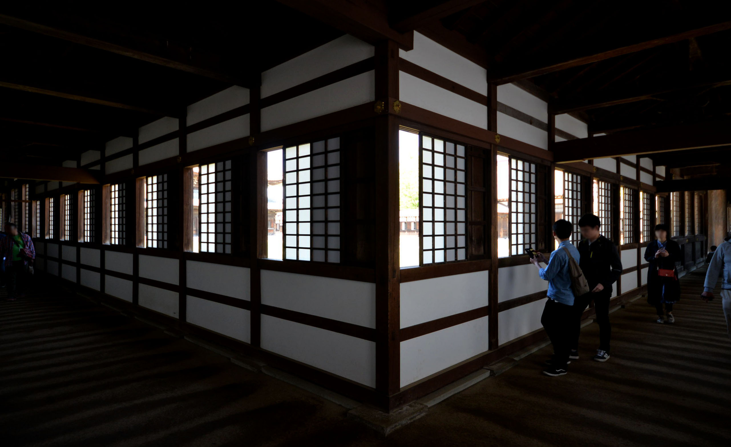柱間に腰板と桟のグリッド、その上には障子と雨戸、そして上部の白壁。