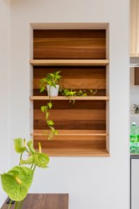 壁の奥行を利用したニッチ。タイルや板張りなど素材によって華やかな印象に。