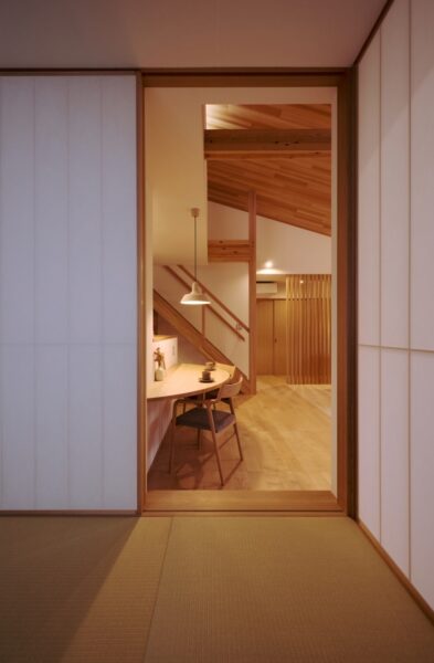 はじめから二人は、「仕切らなくていい」と言っていた。格子や障子を採用し、全体がゆるやかに、大きくつながるK邸では、どこにいても互いの気配が感じられ、どの空間も上質な空気感に包まれている。K夫妻は言う。「品のある家にしたい、と思っていましたが、漠然としたイメージを、隅々に至るまで形にしていただきました」。ここでは、絵画や器だけでなく、家具も、そして二人の生活も作品なのだろう。家という器の中で、二人が過ごす満ち足りた時間が、住まいという作品を、いっそう味わい深くしていく。