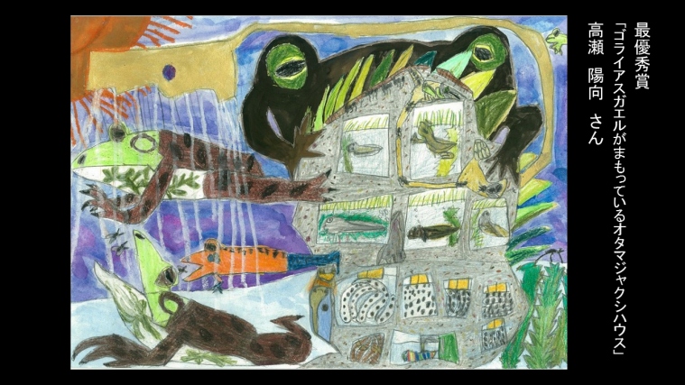 最優秀賞には髙瀬陽向くん(5歳)の「ゴライアスガエルが守っているオタマジャクシハウス」が選ばれました。