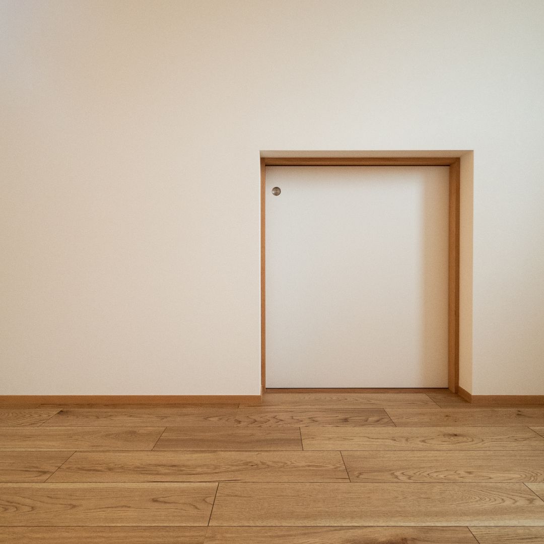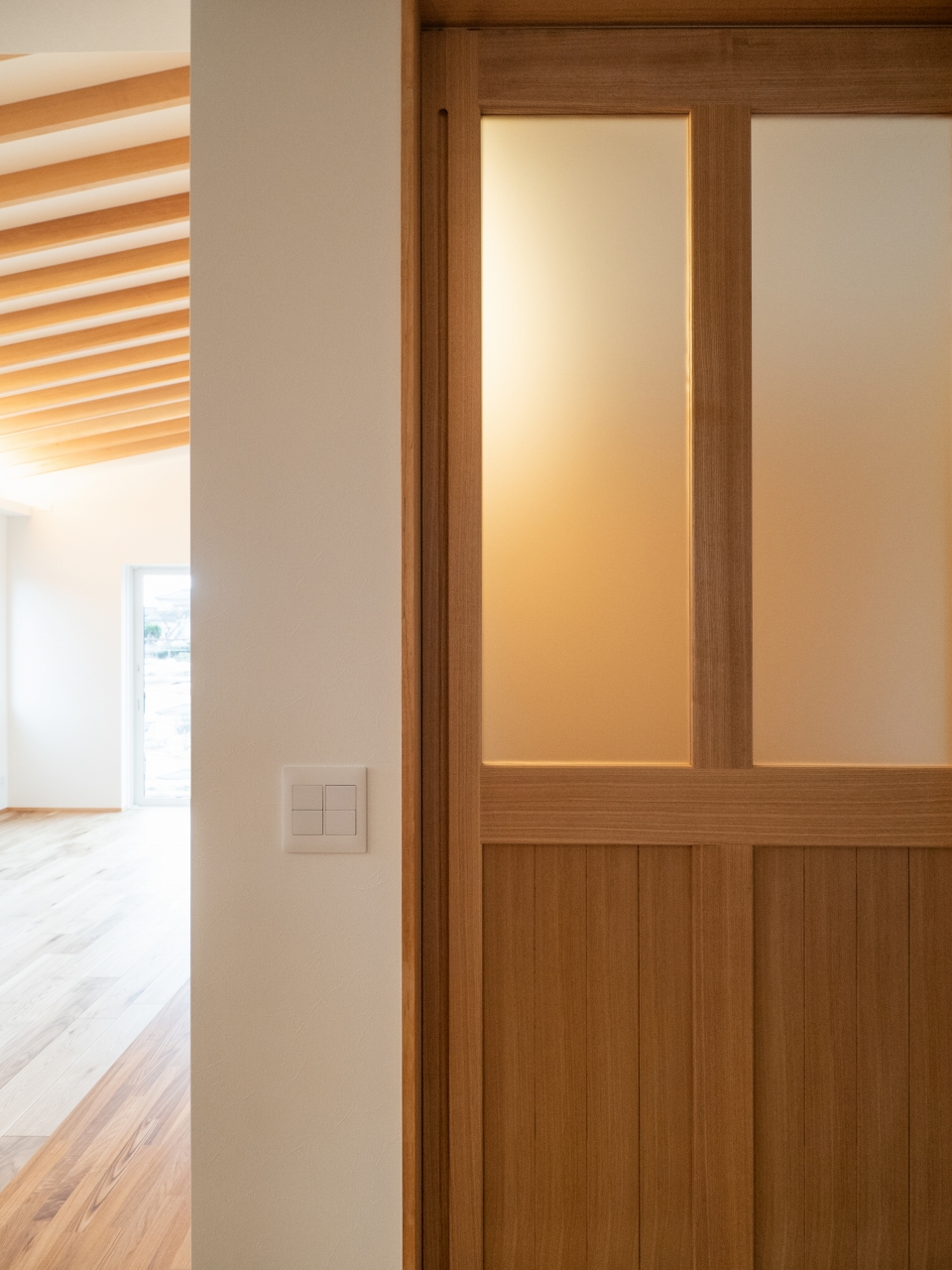 格子窓の造作扉を優しいライン照明で仕上げました。