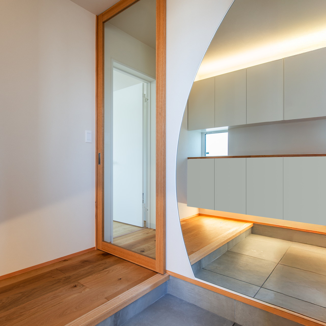 エントランスが広く見えるよう、ワンポイントで大型の姿見を採用