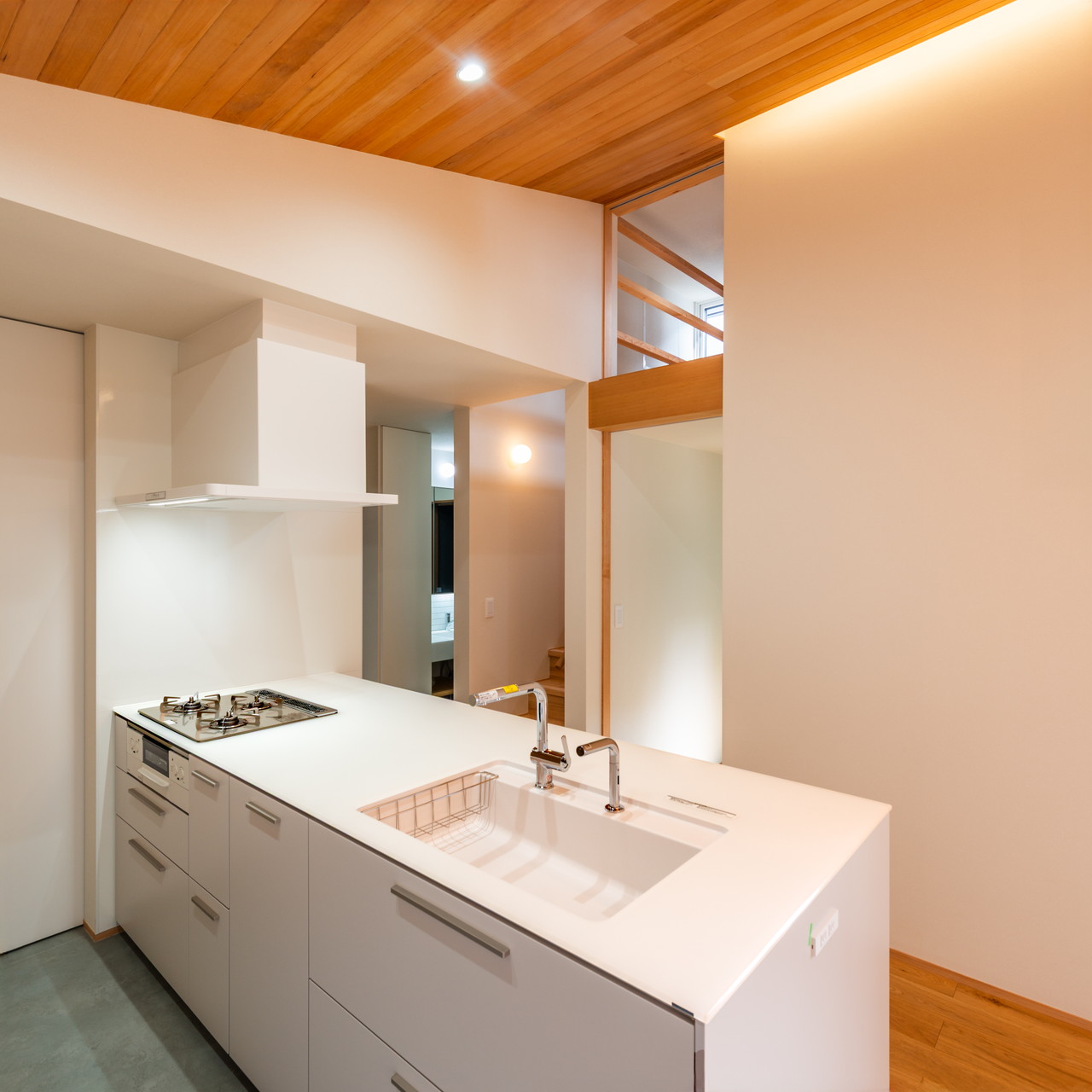 フラットキッチンを採用し、勾配天井による広がりと開放感を強調
