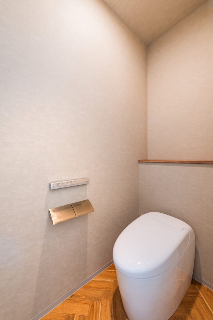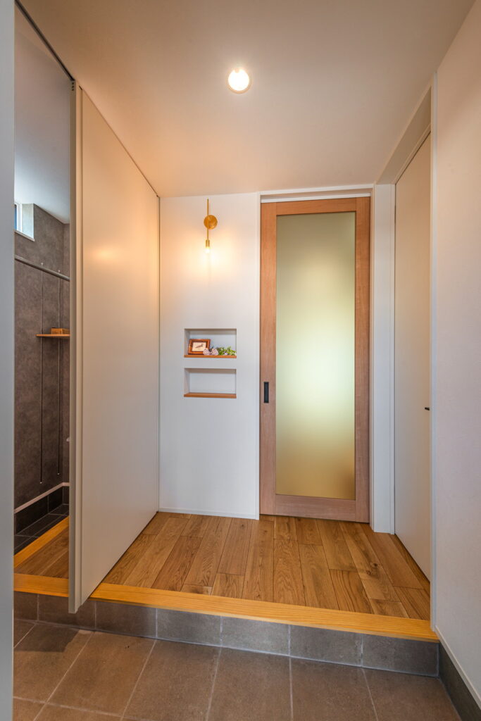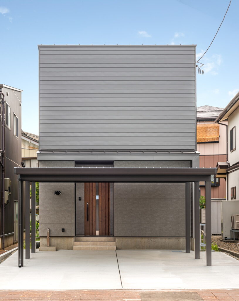 シックなグレートーンの外壁とアクセントの木目玄関ドア