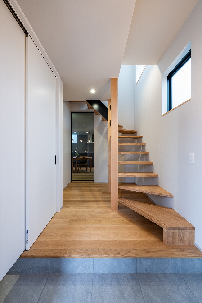 階段上からは朝日が降り注ぎ、LDKまで真っ直ぐ視線が伸びる