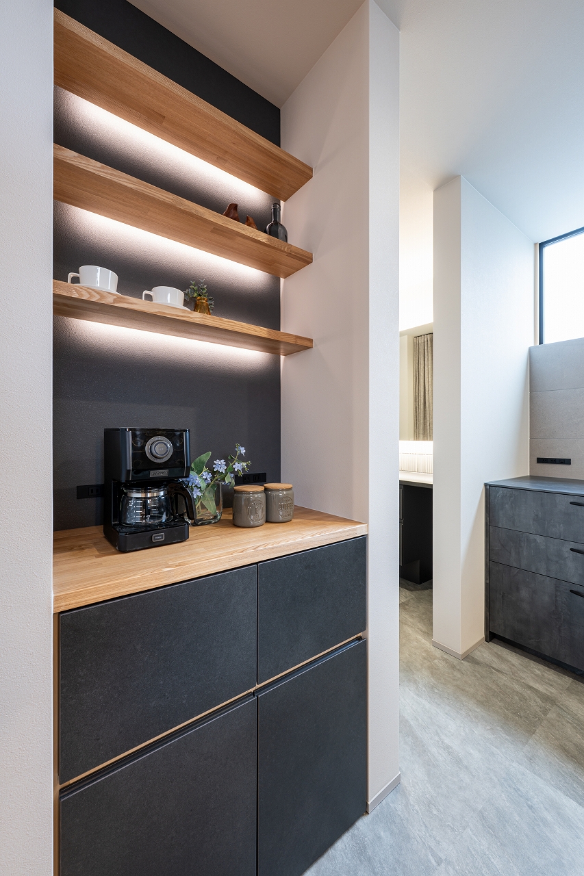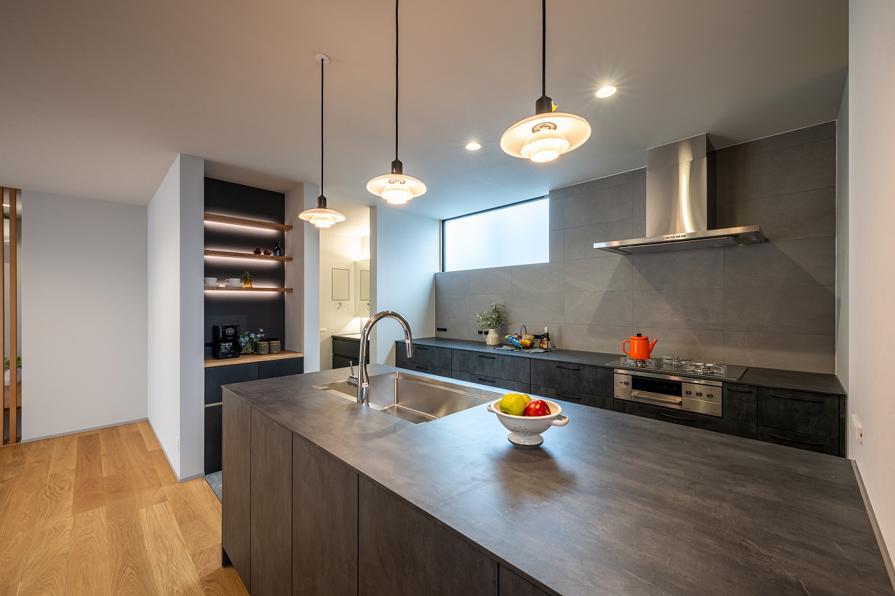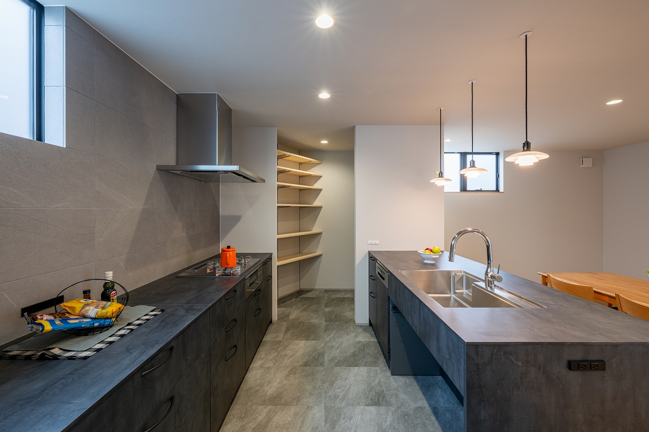 グラフテクトのⅡ型キッチン 奥には敷地形状を活かした広々パントリー