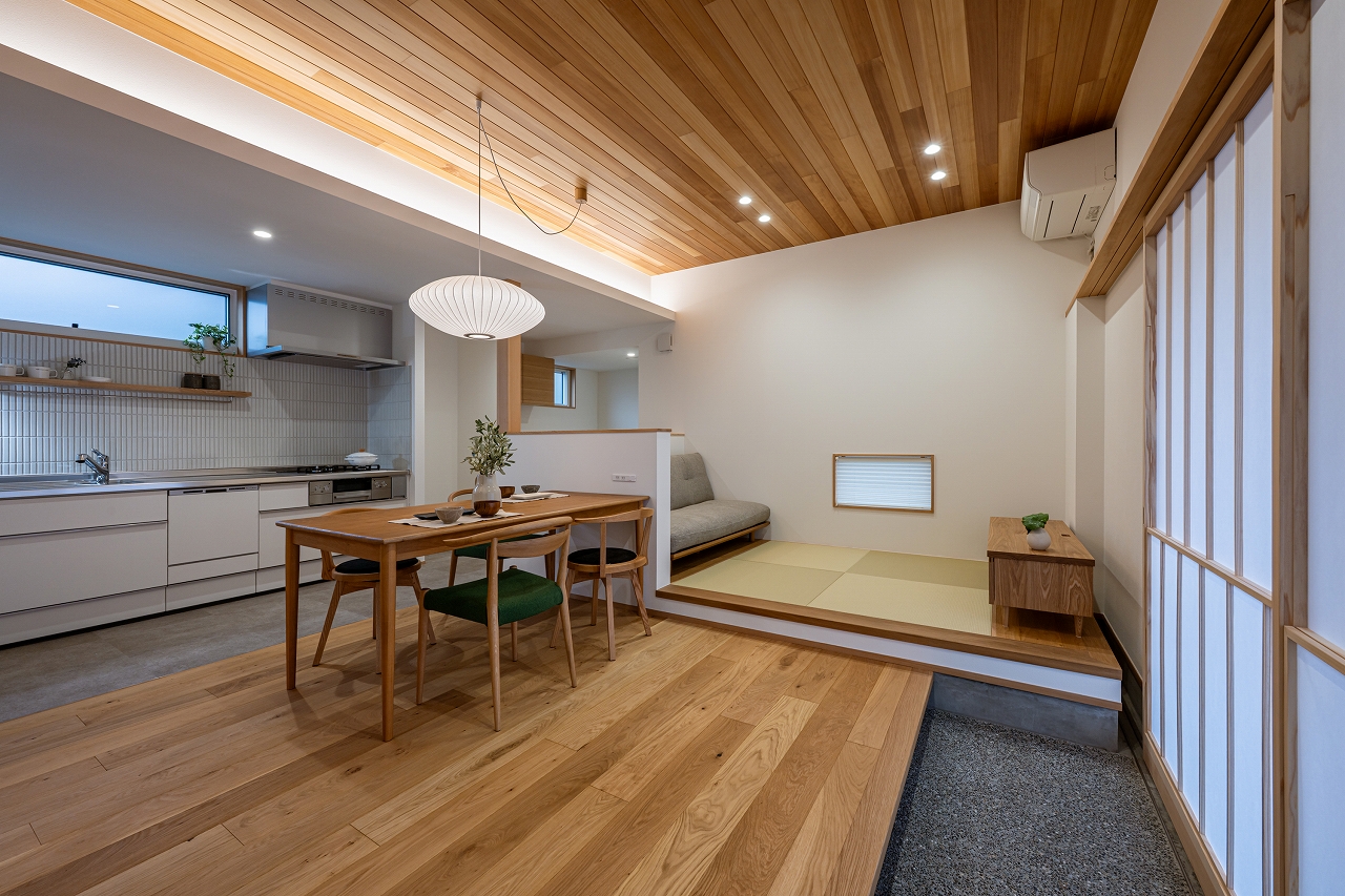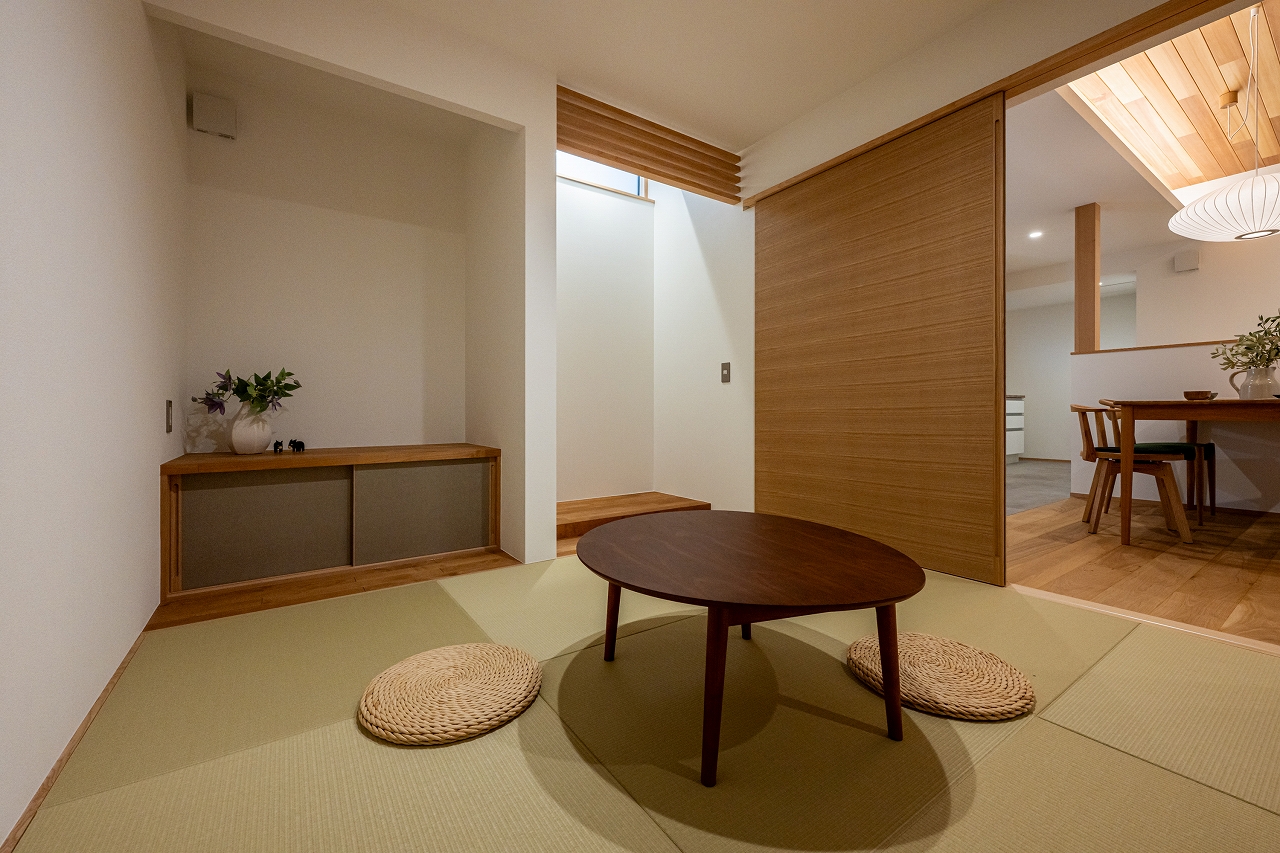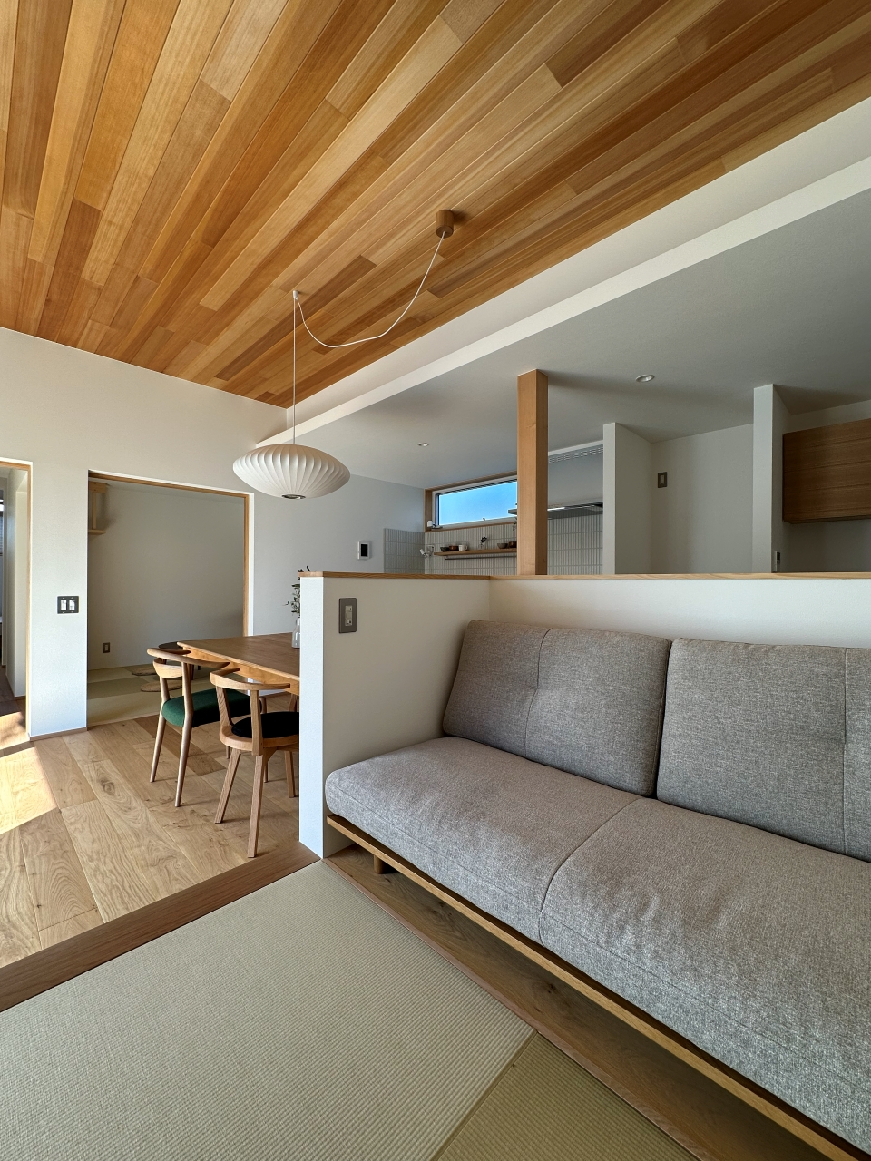 小上がりのタタミリビング。おこもり感のある、腰壁に囲まれたソファ。