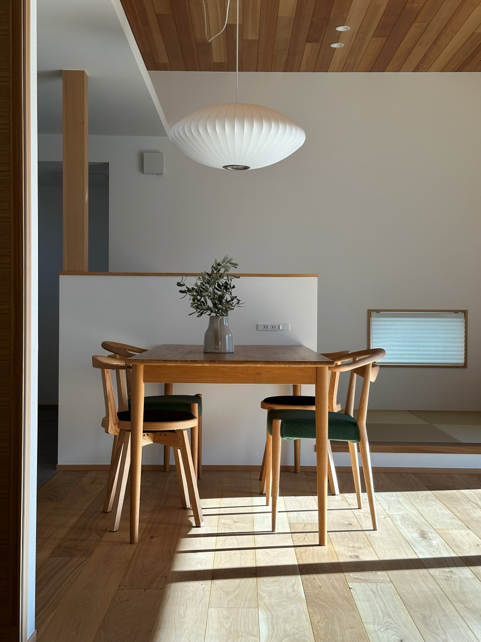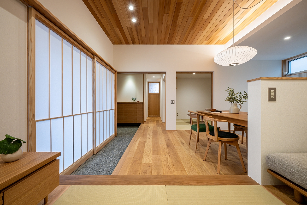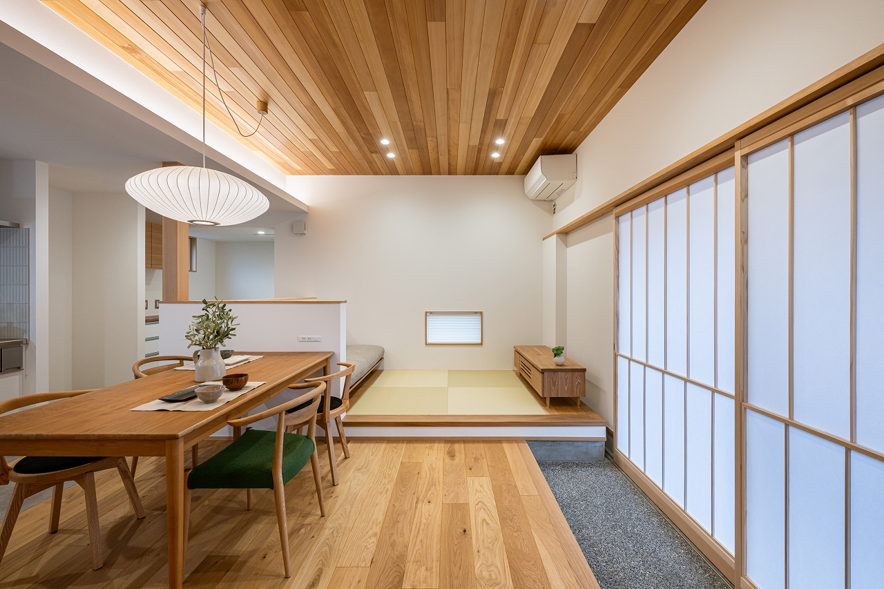 小上がりのタタミリビング。おこもり感のある、腰壁に囲まれたソファ。