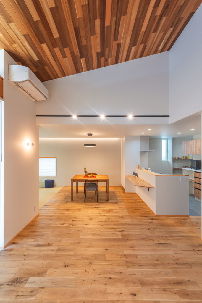 レッドシダー貼りの勾配天井で開放感のあるリビング