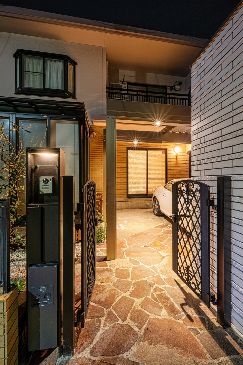 「門柱の灯→カーポートの灯→玄関灯の灯」と光でアプローチを誘導。道路から玄関までをスマートに演出。