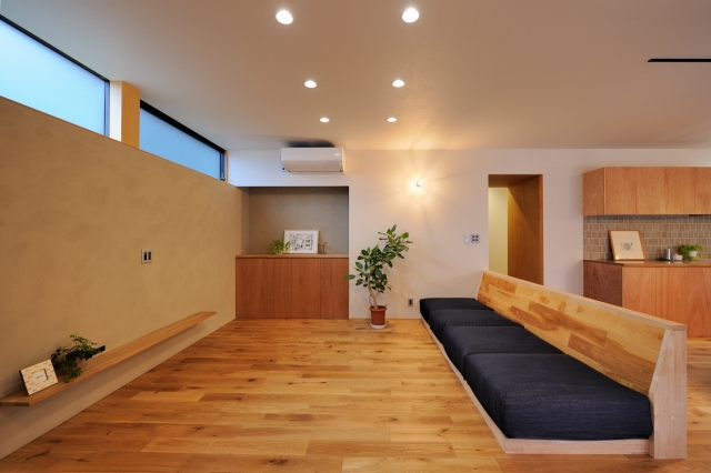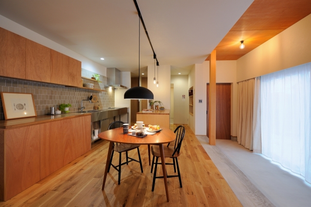 大きなワンフロアの中で 無垢材、土間、タイル、塗り壁 と素材を変えて