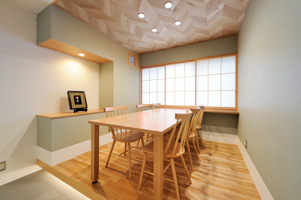 デザインモチーフには「日本建築の茶室」「露地」を採用しました。 世界中からやってくる皆様に<ジャパニーズおもてなし>を添えさせていただきたいからです。 玄関から2階の応接室までの長いアプローチを活かし、茶道のストーリー(外露地→内露地→茶室)を空間に投影することで、茶道のおもてなしの関係性を応接室でのお客様との出会いに重ねています。